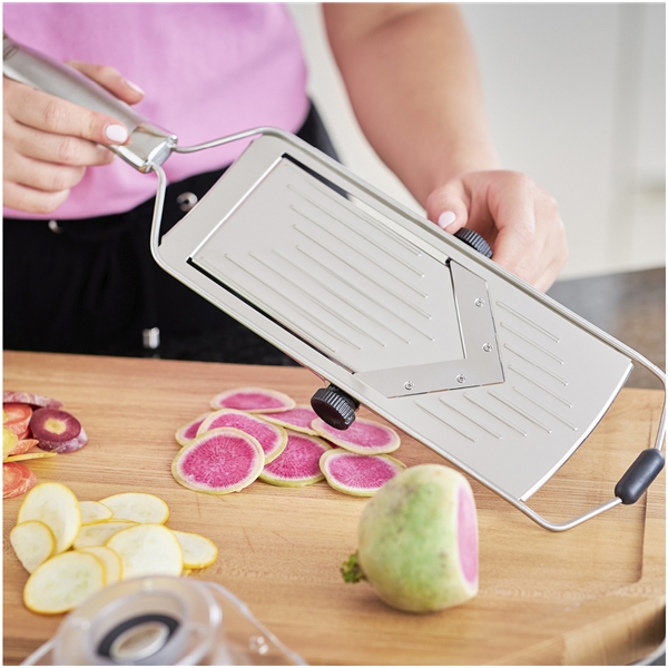 Rösle mandolin har extremt vass V-formad egg som enkelt skär även tomater precist och jämnt.