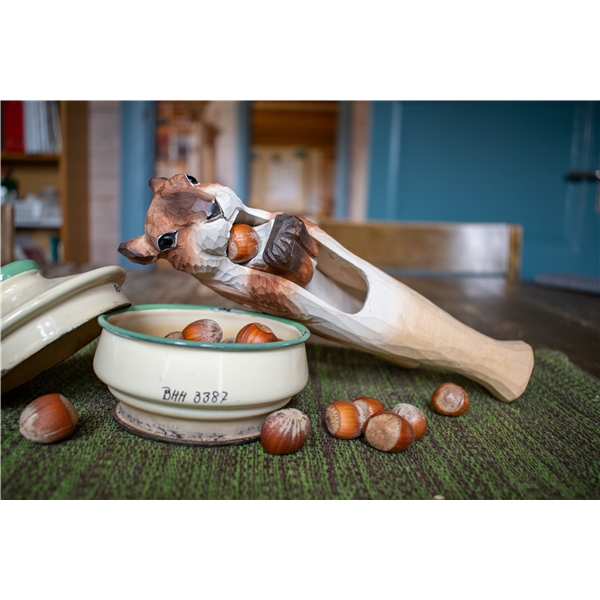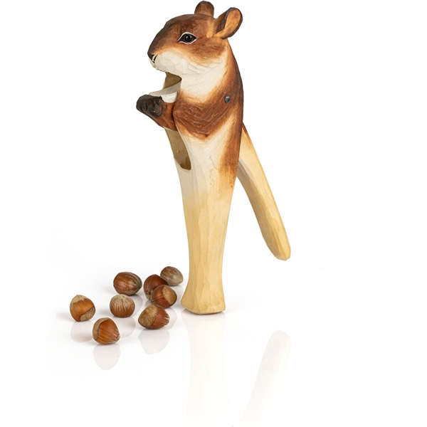 Nötknäckare från Wildlife Garden i massivt lindträ. Nötknäckaren kan knäcka upp till 3 cm stora nötter genom att klämma ihop handtagen. Tillverkad för hand i snidat trä och målad i miljövänliga färger.