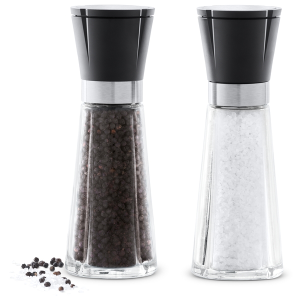 De robusta och moderna Grand Cru salt- och pepparkvarnarna från Rosendahl blir snabbt klassiker i köket. De har stora burkar och den keramiska kvarnen är placerad på toppen för att undvika salt- och pepparspill. Välj om du vill ha finmalet eller grovmalet. Levereras i ett set med två kvarnar!Burken tål diskmaskin i en temperatur upp till 50-55°C. Det svarta nylonet, stålet och de keramiska delarna tål ej diskmaskin.