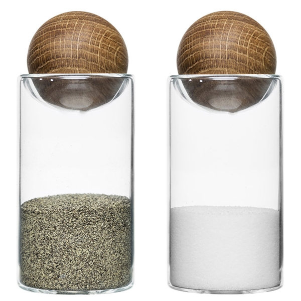 Fint Oval Oak salt- och pepparset i glas och ek. Ligger förpackad i giftbox.