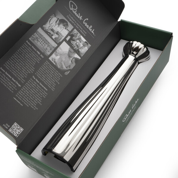 Tillverkad av högkvalitativt 18/10 rostfritt stål, känns kvarnen robust och taktil i handen. Den avancerade keramiska mekanismen från CrushGrind säkerställer en smidig och jämn malning och kan enkelt justeras från finmalet till grovkornigt. Det spegelpolerade stålet reflekterar ljuset på ett vackert sätt, och kvarnens svarta hals och bas markerar den tydligt som en pepparkvarn.