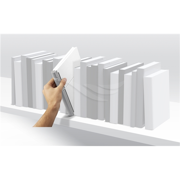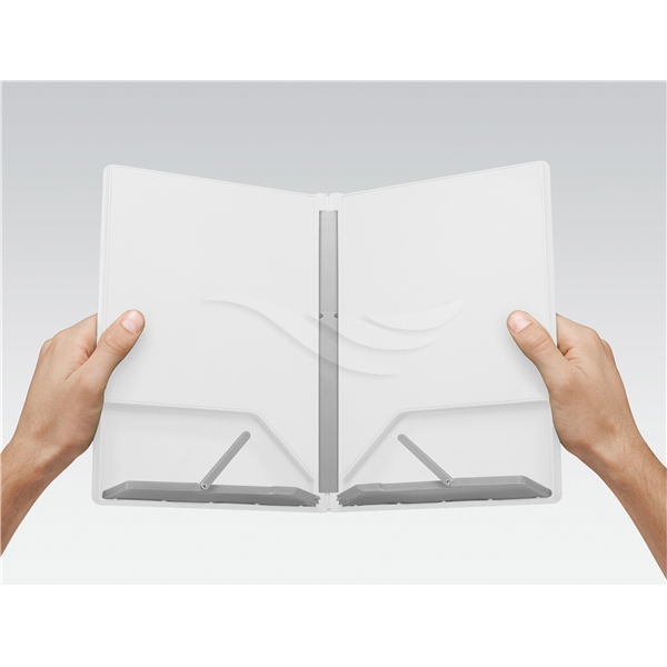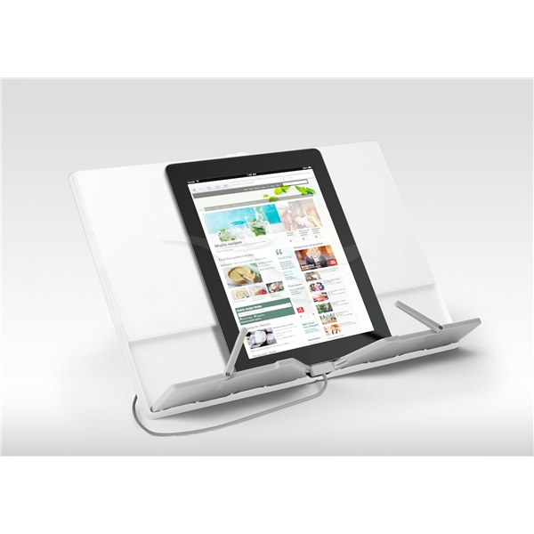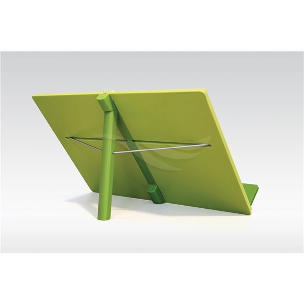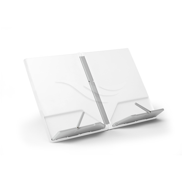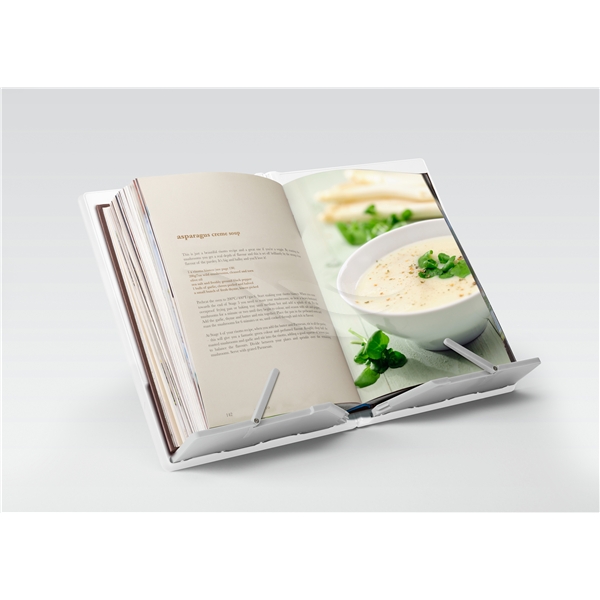 Kompakt hopfällbart Kokbokställ.Problemet med de flesta kokbokställ är att dom ofta är skrymmande i sin storlek och tar upp värdefullt utrymme när det inte används. Detta unika kokbokställ undviker just detta eftersom det öppnas och viks precis som en bok, vilket innebär att den kan lagras snyggt på en hylla med andra böcker tills den behövs.Ger stöd för de flesta storlekar av böcker och surfplattor. En halkfri fot vid basen av ryggraden håller enheten på plats på arbetsytan under användning. När den är stängd blir den inte tjockare än en medelstor bok ca 2 cm.
