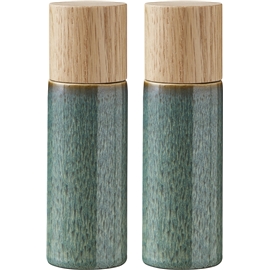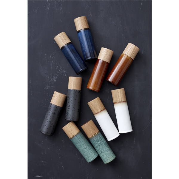 Designen är enkel och elegant, och kvarnarna ligger bra i handen. Kvarnarna är utrustade med keramisk kvarn med 5 års garanti. Vi rekommenderar att toppen i ek underhålls kontinuerligt med neutral olja så att träets lyster bevaras. På grund av tillverkningsprocessen förekommer både färgskillnader och variationer i glasyren, vilket ger varje exemplar ett helt unikt utseende.