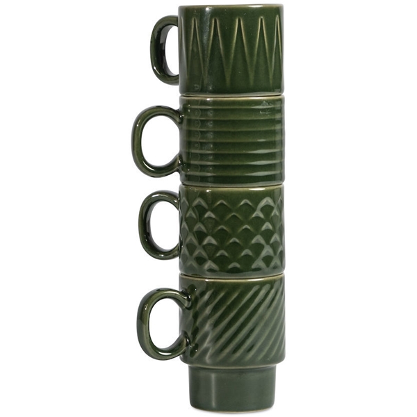 Espressomugg 4-pack med karakteristisk relief. Espressomuggen är en del i serien Coffee & More, framtagen av Sagaform i samarbete med designern Margot Marolo. Seriens design är en flört med 70-talets direkta, lekfulla och raka språk. Serien finns i olika delar, mönster och färger och gör sig allra bäst i en härlig mix av allt! Fungerar som espressomugg men även perfekt som glöggmugg. Tål mikrovågsugn och maskindisk.