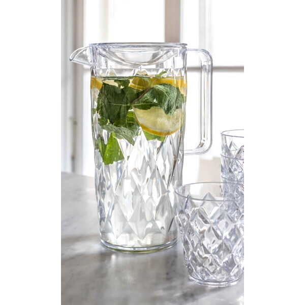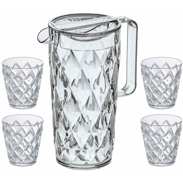 Snyggt set med CRYSTAL vattenkaraff 1,6 liter och fyra stycken matchande glas. Karaffen och glasen tillhör den okrossbara plastglasserien Superglas från Koziol, tillverkade i 100% återvinningsbar och giftfri thermoplast. Ekovänlig design och tillverkad i Tyskland.