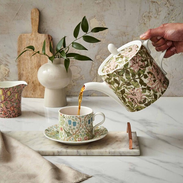 Morris & Co Honeysuckle Teakanna 110cl. Teakanna i vackert mönster från Morris & Co. Perfekt till frukost, fikan eller när du vill lyxa till det lite extra. Teakannan är framtagen i ett samarbete mellan Spode och Morris & Co, det vackra mönstret är resultatet.Volym: 110 cl.