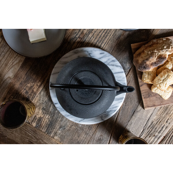 En mycket vacker rund tekanna av gjutjärn som lyser upp tebjudningen med sin form och mönster. Järnet i tekannan renas i samband med gjutningen. Kannans insida är emaljerad vilket skyddar den mot rost och gör den lättdiskad.