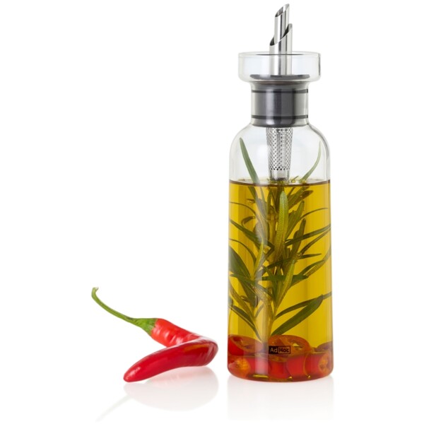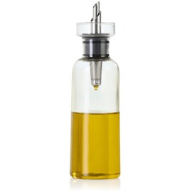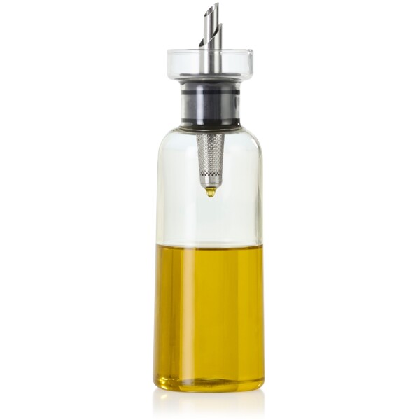 Flaska för den finaste olivoljan, smakrik pumpafröolja, den finaste vinägern och mycket mer. 4-i-1 - Pip, droppfångare, automatisk stängning och filter i rostfritt stål. Flaskan är tillverkad av helt smakfritt borosilikatglas. Lätt att öppna och fylla tack vare det stora påfyllningshålet.