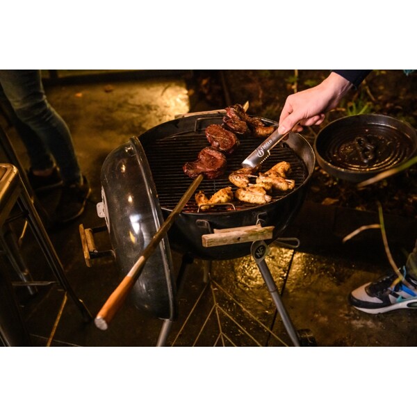 V-format spett 50 cm, är tillverkat av högkvalitativt stål i kombination med olivträ. Handtaget har en rund till oval form och är gjord av olivträ. Detta gör den väldigt bekväm att hålla i. Tack vare dess vassa spetsar kan du enkelt trä vilken kött-, grönsaks- eller fruktbit som helst på ditt spett och spettens V-form ser till att det sitter stadigt på plats under grillning och servering.