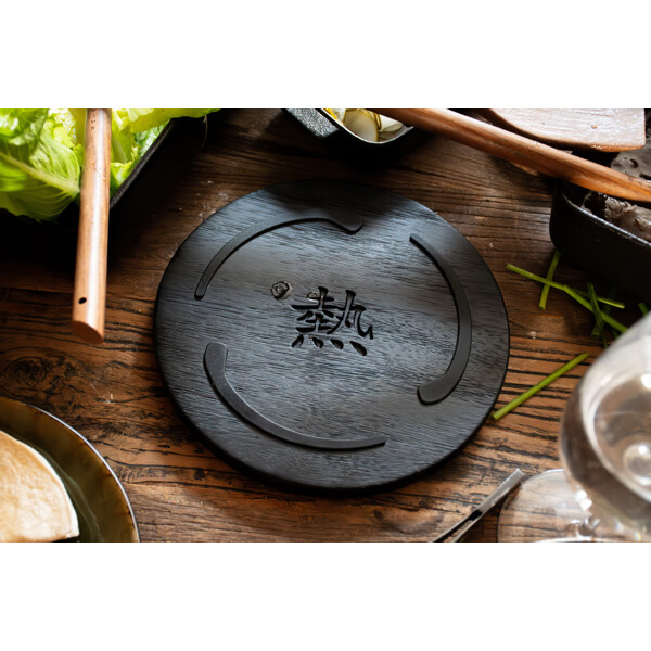 Underlägget är tillverkat av svartlackerat akaciaträ och ovansidan är prydd med ett tunt silikonmönster inspirerat av den japanska cirkeln "Ensō", vilket ger ett stabilt och mjukt stöd för varma kärl. I mitten är den japanska symbolen 熱 (Hetta) ingraverad, och på kanten Satakes numera klassiska logo.