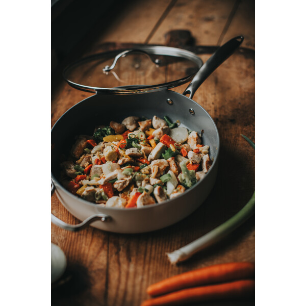 Rymlig traktörpanna 4,7 liter Ø28 cm med KFFC keramisk beläggning (generation 8) som ger riktigt bra non-stick-effekt utan PFAS. Tillverkad i tjock aluminium med hårdanodiserad utsida och rostfri botten - passar alla spisar inklusive induktion. Med medföljande glaslock är den perfekt för både vardagsrätter och bjudmiddagar.