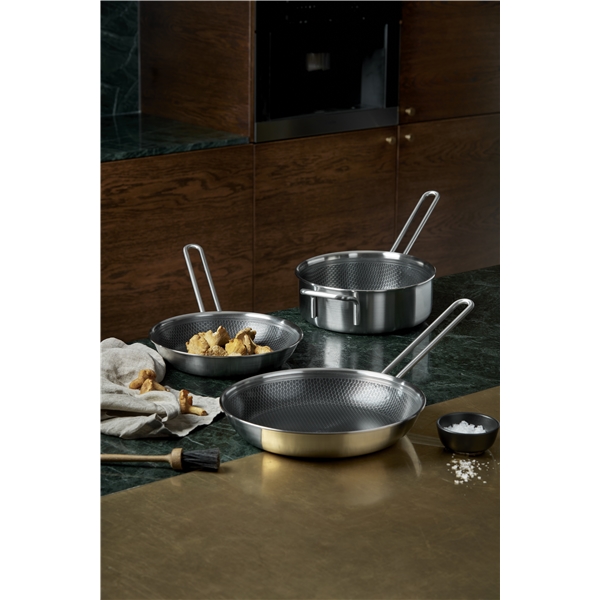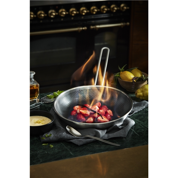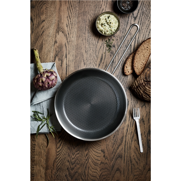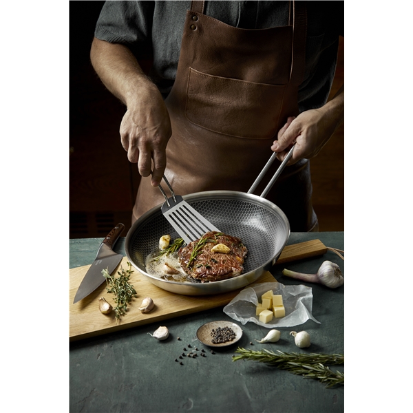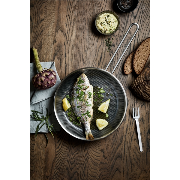 Oumbärlig allround-stekpanna med banbrytande keramisk beläggning som gör pannan enastående slitstark. Pannans unika mosaikmönster består av rostfritt stål i toppen och keramisk Slip-Let®-beläggning i botten och tål metallredskap. Beläggningen gör det möjligt att minska mängden fett, ger den perfekta stekytan och gör rengöringen enkel. Stekpannan har en konstruktion i 3 lager som säkerställer optimal värmefördelning och en hård utsida står emot slitage och användning. Använd pannan till allt från stekt ägg till köttfärs- och grönsaksbiffar. Pannan tål ugn, upp till 400 °C, och passar på alla värmekällor inklusive induktion.