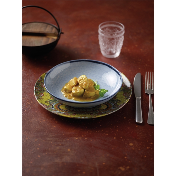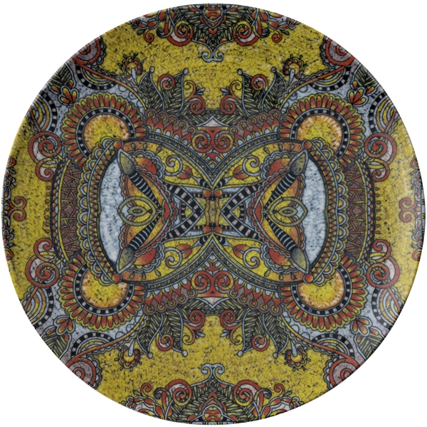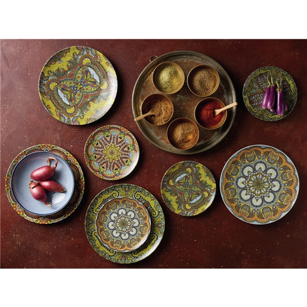 Mandala öppnar bordet för en exotiska atmosfärer och erbjuder oändliga kombinationer och växlingar av fullt dekorerade tallrikar, för servering av aptitretare eller maträtter runt om i världen. Mixa och matcha för ett levande dukning. Går med fördel att blanda med ditt enfärgade porslin som förrättstallrik eller som uppläggningsfat.