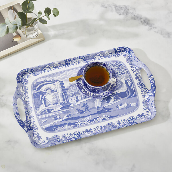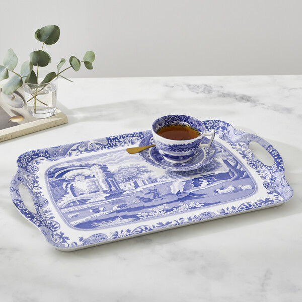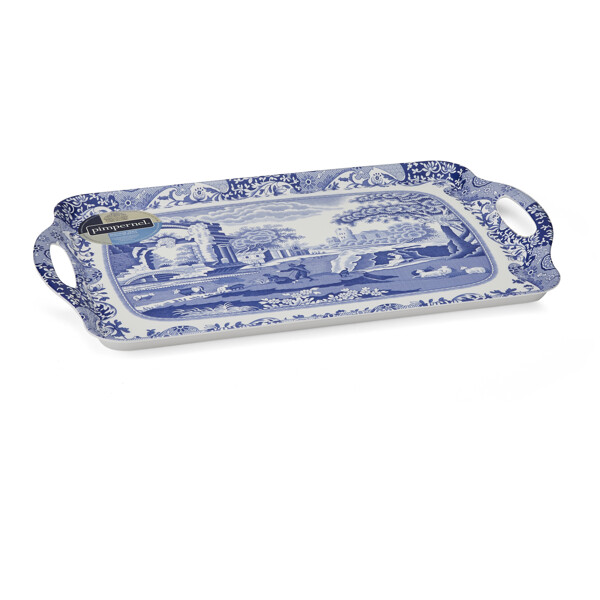 Blue Italian lanserades redan 1816 och har tillverkats sedan dess av Spode. Väldetaljerad med inspiration hämtad ur den äldre Italienska landsbygden omsluten i en ram utav ett 1700-tals Imari Oriental. Blue Italian Bricka med handtag kan kompletteras med en mängd andra artiklar både porslin,textilier och brickor i den vackra och tidlösa Blue Italien kollektionen.