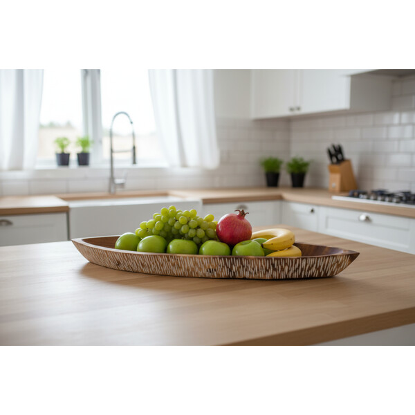 Ge ditt hem en touch av unik, hantverksmässig stil med denna utsökta handgjorda träkanotbricka. Omsorgsfullt tillverkad i Thailand, pryds dess eleganta båt liknande form som vackert framhäver det naturliga träets ådring. Denna 100% handgjorda och miljövänliga skapelse är ett resultat av genuint hantverk, perfekt för att förhöja ditt hem med hållbar skönhet och mångsidig funktionalitet. Storlek: Cirka 12 x 45 x 5 cm Material: Tillverkad av 100% naturligt trä. Hantverksmässig Perfektion: Varje skål är helt handgjord och genomgår en intrikat process av slipning, formning, polering och målning, vilket garanterar dess unika karaktär och överlägsna kvalitet. Miljövänlig: En dekorativ artikel från Thailand helt naturlig.Unik Design: Har en elegant kanot form med distinkta snidade vita linjer, idealisk för att ge din inredning en modern organisk touch. Användningsidéer: Dekorativ Accent: En stilfull mittpunkt för soffbord, konsolbord eller hyllor. Serveringsbricka: Perfekt för att servera snacks, små aptitretare.Allt-i-allo: Organisera nycklar eller fjärrkontroller med konstnärlig stil.