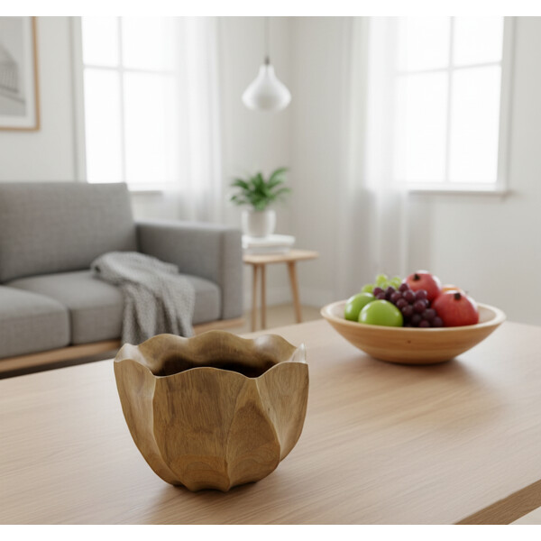 Försköna ditt hem med denna unika handgjorda träskål, som tillför organisk elegans och hantverks charm till vilken miljö som helst. Skickligt tillverkad i Thailand, har denna skål en distinkt tulpan form, komplett med vackert skulpterade, vågiga kanter som framhäver träets naturliga skönhet och ådring. Som ett miljövänligt föremål står den som ett bevis på autentiskt hantverk, perfekt för att fylla ditt rum med hållbar konst och funktionell inredning. Storlek: Cirka 25 x 25 x 20 cm Material: Tillverkad av 100% naturligt trä. Handgjord Kvalitet: Varje skål är helt handgjord och genomgår en process av slipning, formning och målning, vilket garanterar dess unika karaktär och överlägsna kvalitet. Miljövänlig: En dekorativ artikel från Thailand som stödjer miljömedvetet boende. Unik Design: Har en fascinerande tulpan form med en naturligt skulpterad form, idealisk för att tillföra organisk och värme till din inredning. Användningsidéer: Perfekt på matbord eller konsolbord, även när den är tom. Snygg Förvaring: Organisera nycklar eller små nödvändigheter i din hall.