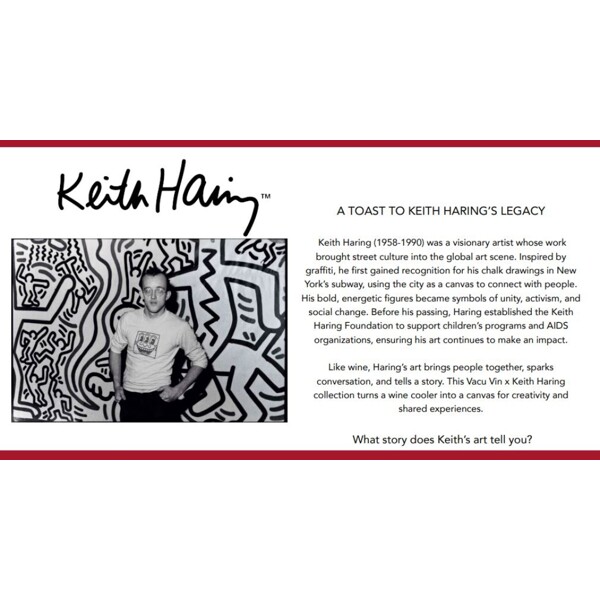Håll ditt vin svalt med stil med den här iögonfallande kylaren, tillverkad av förstklassigt rostfritt stål och med ikoniska Keith Haring-konstverk. Premiumkvalitet: Tillverkad av högkvalitativt rostfritt stål (304 - 18/8) med dubbelväggsisolering för långvarig prestanda. Universell passform: Passar de flesta storlekar på vin- och champagneflaskor, inklusive 1,5L flaskor (max diameter 108 mm). Ikoniska Keith Haring-konstverk: Ett måste för vin- och konstälskare. © Keith Harings stiftelse. Licensierad av Artestar, New York.