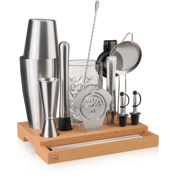 Funktioner: Unikt elegant korkstativ för att visa upp verktygen. Inkluderar ett recepthäfte: Lätta att följa cocktailrecept som du kan prova hemma. Kanalisera din inre hemmabartender med verktyg från Vacu Vin och recept från cocktail pro. Komplett cocktailset med 16 barverktyg för att skapa skakade och omrörda cocktails med stil. Det är den perfekta presenten till alla cocktailälskare. Blanda, skaka, fira!