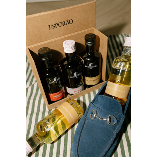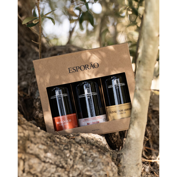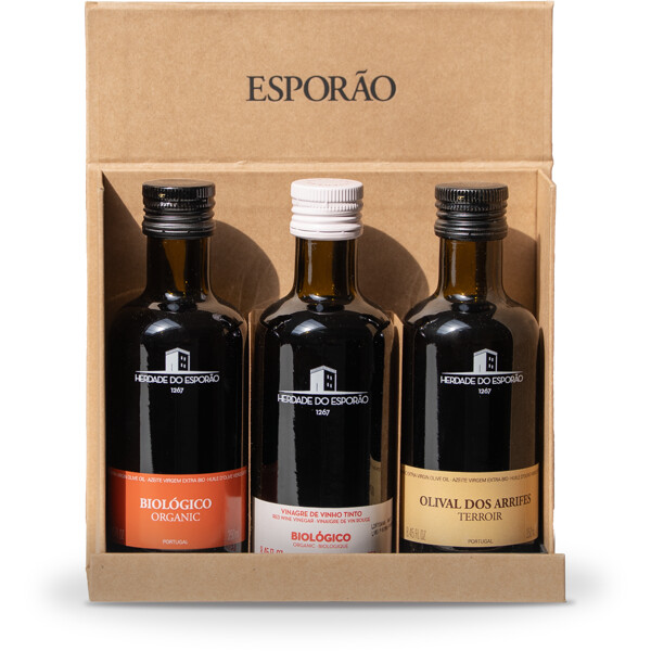 Uppskattad presentbox inne-hållandes två stycken ekologiska olivoljor med två olika karaktärer samt en ekologisk rödvinsvinäger.