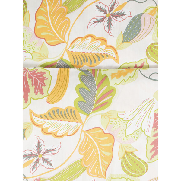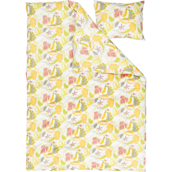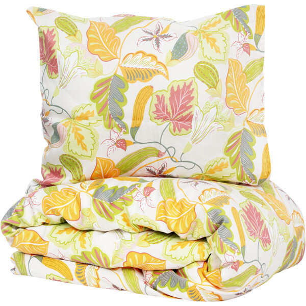 Bäddset i skön och mjuk satin. Vit botten med stort mönster av slingrande blommor, blad och frökapslar som genom sin färgrikedom för tankarna till Monets trädgårdar.