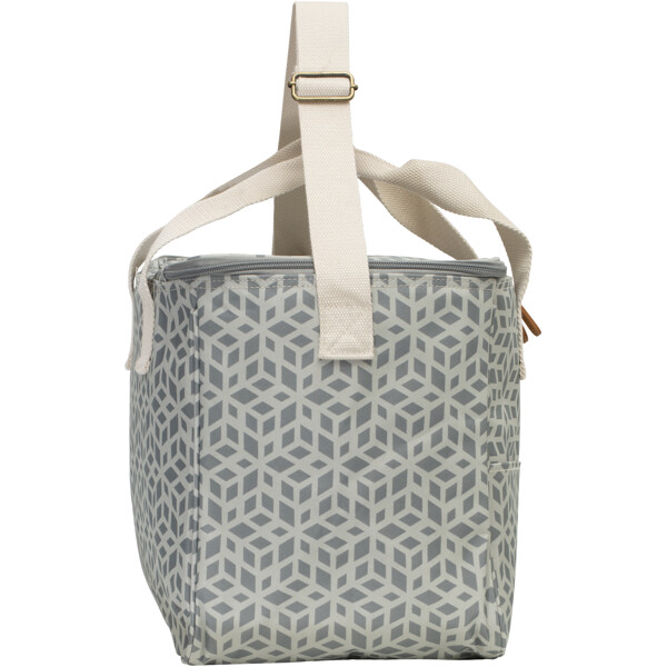 Kylväskan behåller kylan länge tack vare den tjocka PEVA-vadderingen som även är lätt att torka ur och av. Den är tillverkad av återvunnet material från PET-flaskor med handtag och axelrem i bomull och konstläder.