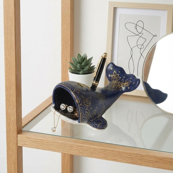 Dyk in i unik inredning med vår härliga handgjorda Val. Omsorgsfullt tillverkad i Thailand av återvunna pappers kärnor, är denna charmiga val dekorerad med handmålade thailändska motiv, inspirerade av den vackra traditionella konststilen. Den fungerar som en dekorativ prydnad, och dess öppna mun ger också en unik plats för att förvara smycken, små skatter.Storlek: Ungefär 11 x 16 x 9 cm. Material: Papier-maché av återvunnet papper, främjar hållbar inredning. Handmålad med detaljerade thailändska mönster, vilket ger varje val en distinkt konstnärlig karaktär. Den bedårande val formen ger en lekfull men ändå elegant touch till vilket rum som helst. Dess öppna mun erbjuder en smart och diskret plats för smycken, småsaker eller som en unik pen hållare. Lätt att rengöra med en fuktig trasa