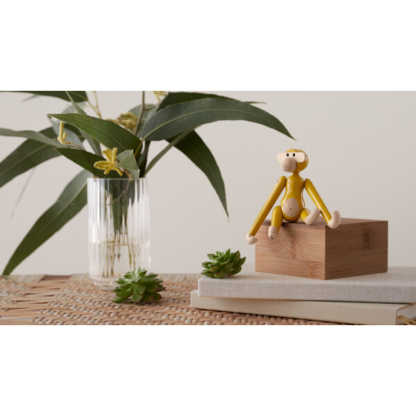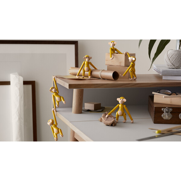 Ett färgstarkt original i en nostalgisk och nyskapande look. Kay Bojesens ikoniska apa är en känd och älskad humörhöjare bland både stora och små. Med miniapan i bokträ målad i originalfärger från arkiven blir glädjen ännu större. Den färgade miniversionen är inspirerad av färgerna på en originaltapet som Kay Bojesen designade för barnrummet i slutet av 1940-talet. Du riktigt ser originaliteten och känner retrovibbarna i de dämpade färgerna som snyggt framhäver bokträets svala uttryck. Aporna är 9,5 cm hög och är tillverkad av FSC®-certifierat bokträ som framträder på händer och fötter, ansikte och mage och ger den nya miniapan en lite käck och ungdomlig karaktär. De målade miniaporna sprudlar av glädje och uppfinningsrikedom och sätter vackert och självsäkert Kay Bojesens ursprungliga berättelser i trä i en ny kontext. Samtidigt förblir de ikoniska tack vare de klassiska färgerna från Kay Bojesens ursprungliga universum som gör miniapan perfekt som ett lekfullt element i en modern inredning. Den lockar fram leenden och skapar en unik stil med sin finurliga framtoning och sitt färgstarka utseende – oavsett var den flyttar in. Ett måste för designälskaren som har allt. Eller till oss som inte kan få nog av Kay Bojesens apor och deras mysiga sällskap.
