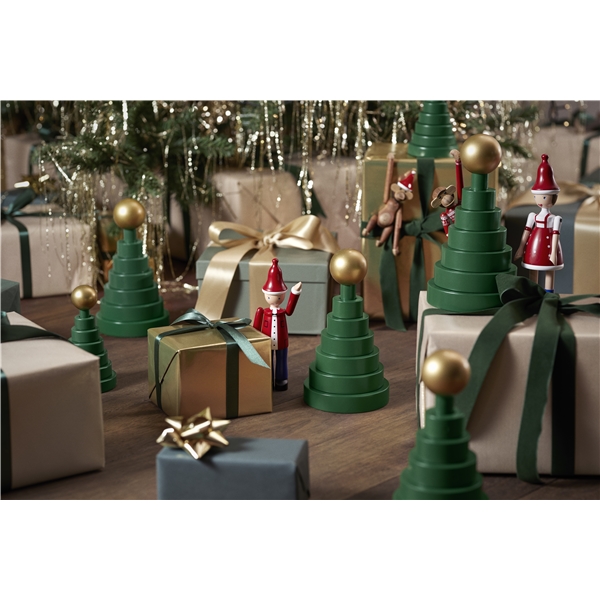 Julmagi tolkat i trä baserat på originaldesign från arkiven. Kay Bojesen skapar originella berättelser i trä året runt, och med julgranen i Kay Bojesens universum får du en ikonisk och stilren juldekoration i en välkänd form baserad på det klassiska stapeltornet. Trädets gröna färg är hämtad från den gröna ringen på tornet och kulan på toppen är målad i guld så att den glittrar som en stjärna. På bilder från arkiven kan man se att Kay Bojesen älskade att göra små jultablåer, och i det sammanhanget använde han själv stapeltornet som julgran för att skapa sina berättelser. Kay Bojesen-julgranen finns både i denna mindre storlek på 13,5 cm eller den lite större versionen på 19,5 cm så att du kan välja exakt den julgran som passar bäst i din dekoration – eller kombinera två eller flera och skapa ett stämningsfullt och minimalistiskt stillben. Julgranarnas ringar är tillverkade i FSC®-certifierad gummiträd, medan den pålimmade toppen är tillverkad i FSC®-certifierad bokträ. Som alltid är den manuella produktionen med färg och tryck är utförd med den stora precision och noggrannhet som kännetecknar alla träfigurer från Kay Bojesen. Träet, färgen och hantverket är i fokus och ger figurerna en alldeles speciell kvalitet – både fysiskt och estetiskt. Kay Bojesen arbetade utifrån en filosofi om att trä får liv först när det får en berättelse. Det var genomgående för alla hans figurer och kommer också tydligt till uttryck med de två julgranarna som med sina runda former och klassiska linjer ger liv åt julberättelsen. På det allra vackraste sätt lever Kay Bojesens lekfulla och fantasifulla tankar vidare i julgranen där kulor i rött och guld är monterade på utsidan av ringarna. Kay Bojesen insisterade på att väcka fantasin och barnet i oss alla – även i december då en omedelbar glädje, förväntan och magi finns runt omkring oss i 24 förtrollande dagar – eller lite mer.