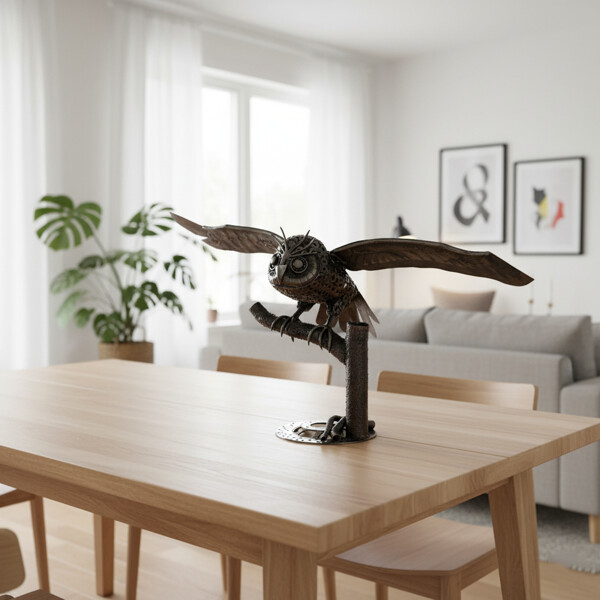 Förhöj ditt dekor med den fängslande närvaron av denna otroliga, 100 % handgjorda metall skulptur av en flygande uggla! Detta är inte bara en dynamisk dekoration; det är ett genuint konstverk, noggrant tillverkat av återvunnen metall, vilket gör det till ett hållbart och helt fascinerande tillskott till vilket hem, kontor eller lokal som helst. Våra skickliga hantverkare har omvandlat återvunna material – observera den fascinerande användningen av olika metall komponenter för dess fjäderklädda kropp och vidsträckta vingar – till en kraftfull detalj av en majestätisk uggla i flykten. Stående på ett robust, industri inspirerat stativ, är varje element genomtänkt integrerat och skapar en verkligt unik skulptur som fångar denna nattliga jägares elegans och styrka, och blandar robust industri estetik med naturens majestätiska skönhet. Mått: Cirka 65 x 25 x 30 cm Miljövänlig 100 % handgjord Återvunnen metall