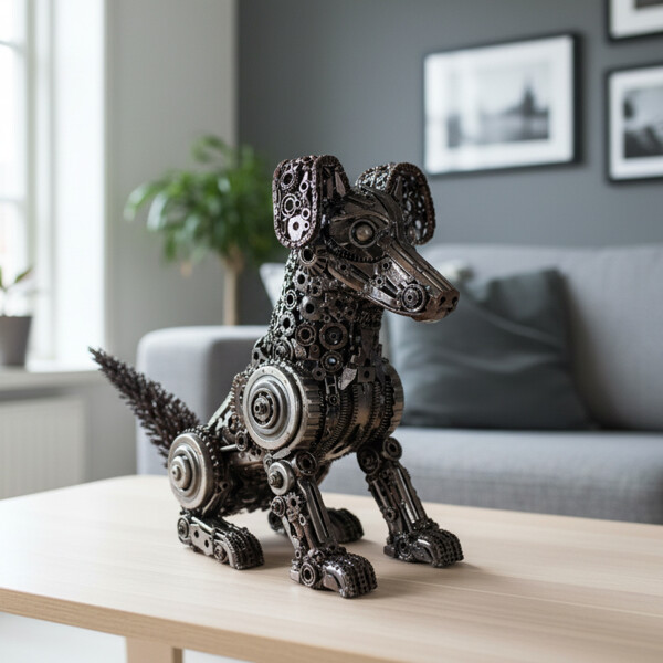 Ge ditt rum charm med vår handgjorda Gear Pup-skulptur, skapad av återvunnet metall av skickliga hantverkare. Varje del berättar en historia om förvandling, med lekfulla detaljer som nyfikna ögon och en viftande svans. Denna unika metallhundskulptur kombinerar rustik industriell stil med delar från återanvända material, vilket gör den till en förtjusande samtals startare och en symbol för hållbar konst. Perfekt storlek för att tillföra karaktär till vilket hem som helst, den förkroppsligar glädje och kreativitet. Mått: Ungefär 30 x 50 x 40 cm Miljövänlig 100% Handgjord Återvunnen Metall