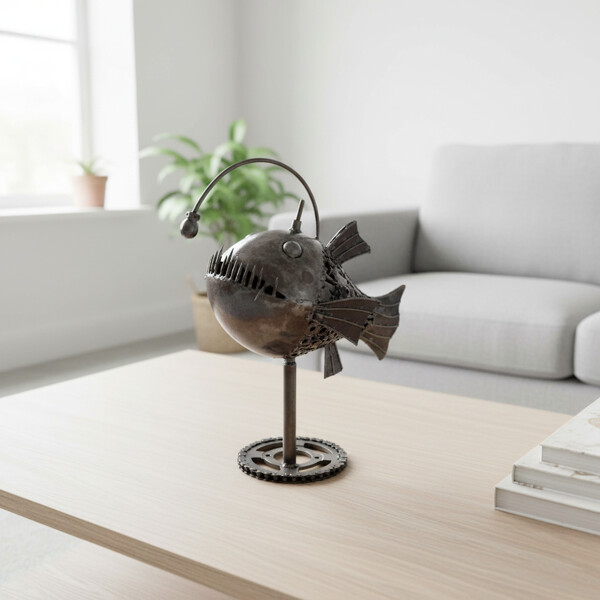 Höj upp din inredning med denna otroliga, 100% handgjorda Glimmerbite Angler Fish-metallskulptur! Detta är inte bara en fascinerande detalj; det är ett äkta konstverk, noggrant tillverkat av återvunnen metall, vilket gör det till ett hållbart och fullständigt fascinerande tillskott till vilket hem, kontor eller kreativt utrymme som helst. Våra skickliga hantverkare har förvandlat återvunnet material till en fängslande och fantasifull presentation av djuphavsfisken Angler Fish, komplett med dess ikoniska lysande lockbete. Varje tagg, varje tand och dess distinkta ljus är format, vilket skapar en verkligt unik skulptur som kombinerar industriell design med mystisk undervattens charm. Den robusta, kugghjuls inspirerade basen garanterar stabilitet och bidrar till dess unika karaktär. Mått: Cirka 25 x 30 x 30 cm Miljövänlig 100% Handgjord Återvunnen Metall