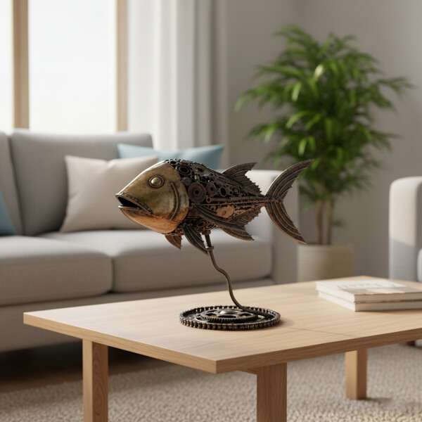 Ge ditt rum en unik marin charm med denna otroliga 100% handgjorda Jack Fish-metallskulptur! Detta är inte bara en dekorativ pjäs; det är ett verkligt konstverk, omsorgsfullt skapat av återvunnet metall, vilket gör det till ett hållbart och fascinerande tillskott till vilket hem eller kontor som helst. Våra skickliga hantverkare har förvandlat återvunna material till en fängslande och detaljerad representation av den mångsidiga Jack Fish. Varje kugghjul, skruv och metall komponent är genomtänkt, vilket skapar en unik skulptur som visar de konstnärliga möjligheterna med återvunnet material. Den robusta, industriellt inspirerade basen kompletterar fisken perfekt och tillför stabilitet och en touch av rå elegans. Mått: Cirka 20 x 35 x 25 cm Miljövänlig 100% Handgjord Återvunnen Metall