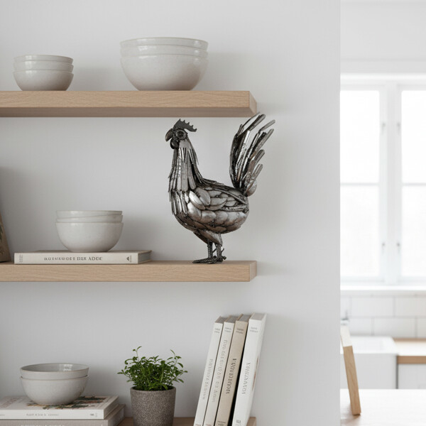 Våra skickliga hantverkare har förvandlat återvunnet material och på ett smart sätt integrerat element som bestick, muttrar och bultar för att skapa en härlig och detaljerad presentation av en höna. Varje fjäder, varje kurva och varje detalj är noga genomtänkt, vilket resulterar i en verkligt unik skulptur som kombinerar lantlig estetik med en unik, återvunnen charm.