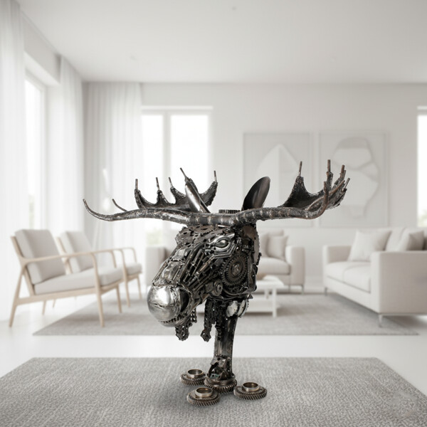 Gör ett oförglömligt intryck med vår Handgjorda älgskalle i metall, ett verkligt anmärkningsvärt och 100% handgjort konstverk. Detta fängslande älghuvud är skickligt sammansatt av återvunnen metall, vilket förvandlar kasserade komponenter till en kraftfull och värdig representation av en av naturens mest ikoniska varelser.