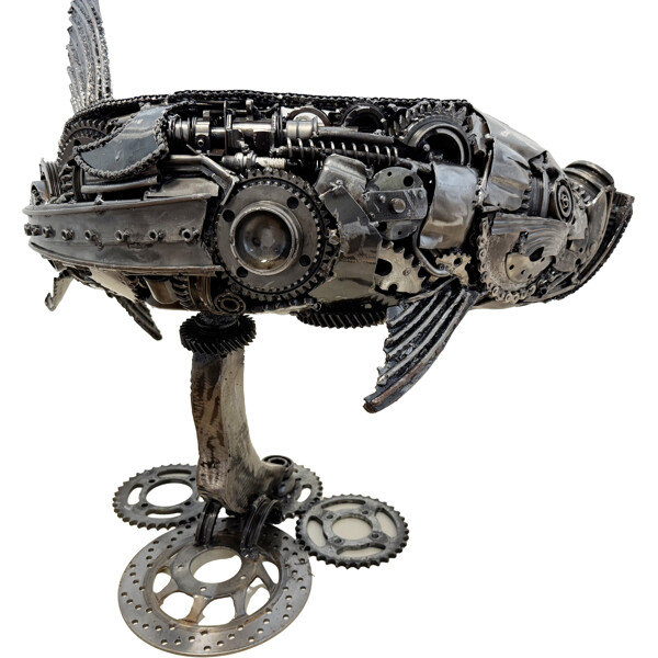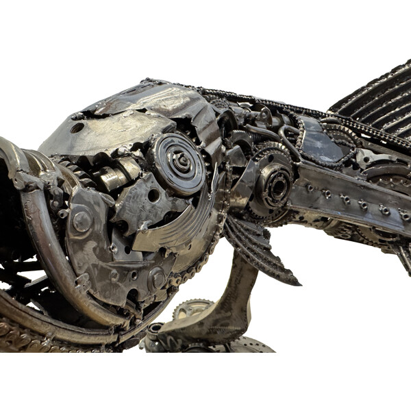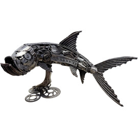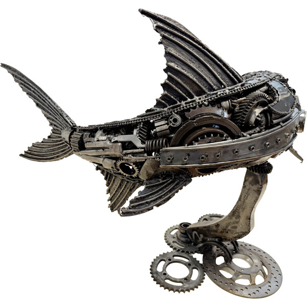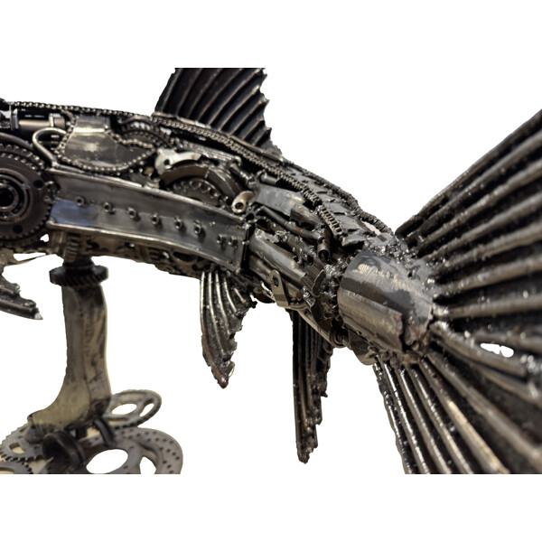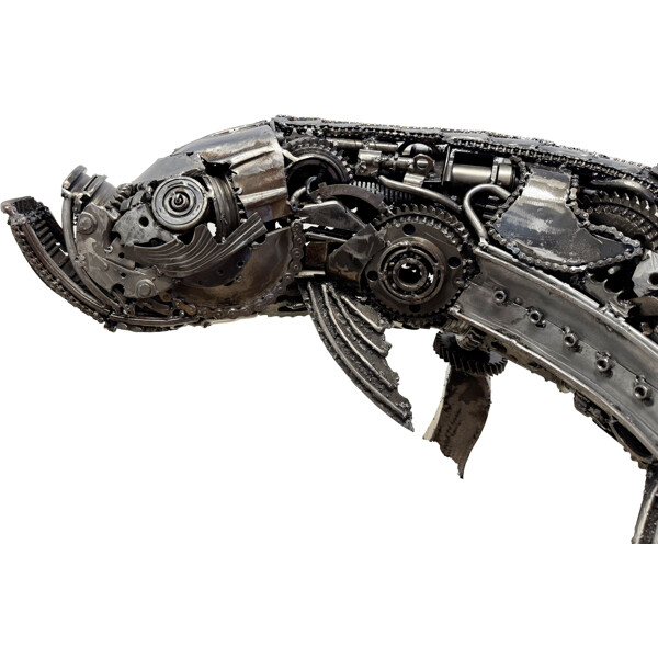 Ta in havets kraft och skönhet i ditt hem eller kontor med denna otroliga 100% handgjorda Tarpon-fiskskulptur i metall! Det här är inte bara en dekoration; det är ett unikt konstverk, noggrant tillverkat av återvunnet metall, vilket gör det till ett hållbart och imponerande inredning till vilken plats som helst. Våra begåvade hantverkare har förvandlat kasserade material till en livfull, dynamisk och magnifik Tarpon. Varje kugghjul, varje kurva och varje fena är noggrant placerad för att skapa en verkligt unik skulptur som fångar essensen av denna ikoniska fisk. Mått: Cirka 70 x 90 x 90 cm Miljövänlig 100% Handgjord Återvunnet Metall