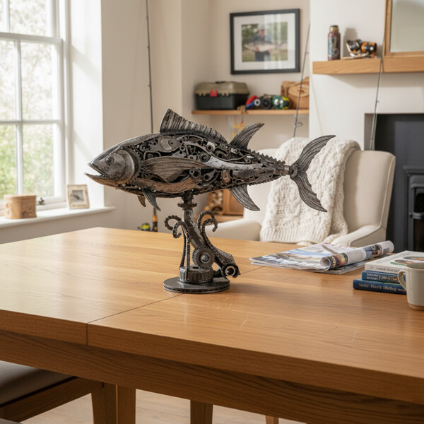 Våra skickliga hantverkare har förvandlat återvunna material till en kraftfull och detaljerad representation av den mäktiga tonfisken. Varje komponent, från de intrikata kugghjulen till de eleganta linjerna på dess kropp, är genomtänkt placerad, vilket skapar en verkligen unik skulptur som fångar essensen av denna snabbgående fisk.