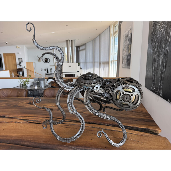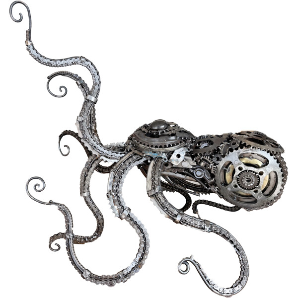 Förhöj ditt rum med vår handgjorda bläckfiskmetallskulptur, ett unikt och 100% handgjort konstverk tillverkat av återvunnet metall. Denna betydande skulptur har lager av kugghjul och kedjor, vilket tillför fantasirik charm och textur. Den är perfekt för att föra in modern design och sofistikerad marin konst i ditt hem eller kontor. Mått: Ungefär 50 x 80 x 60 cm Miljövänlig 100% Handgjord Återvunnen Metall