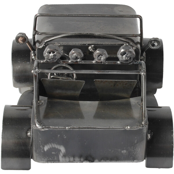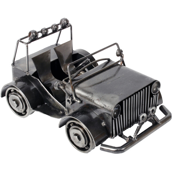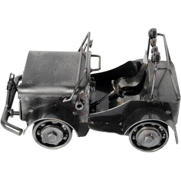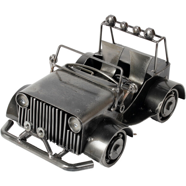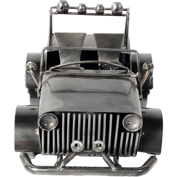 Ge dig ut på en konstnärlig resa med vår Off-Road Jeep-skulptur, ett 100% handgjort konstverk tillverkat av återvunnet metall av skickliga hantverkare. Varje detalj, från grillen till strålkastarna, speglar en berättelse om förvandling och skickligt hantverk. Denna unika skulptur är idealisk för skrivbord eller vitrinskåp och erbjuder en blandning av off-road anda och hållbarhet. Mått: Ungefär 15 x 20 x 20 cm Miljövänlig 100 % Handgjord Återvunnet Metall