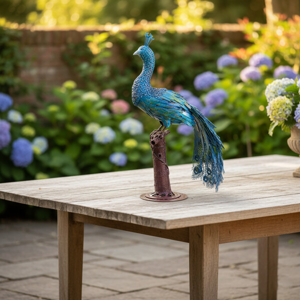 Förnya ditt hem med vår handgjorda påfågelmetallskulptur, ett fantastiskt 100% handgjort verk tillverkat av återvunnen metall. Den eleganta skulpturen, med lager och livfulla blå och gröna nyanser, tillför exotisk charm och konstnärlig stil till vilken inredning som helst.