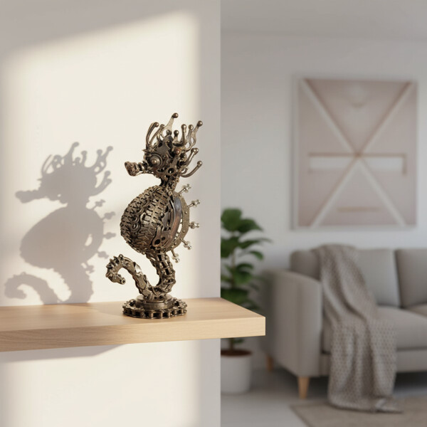 Upptäck ett riktigt fängslande verk som förenar tidlös thailändsk konstnärlighet med samtida hållbar design. Vi presenterar vår utsökta 100% handgjorda thailändska Kanok-sjöhäst i metall! Det här är inte bara en dekorativ föremål; det är ett unikt konstverk, noggrant tillverkat av återvunnet metall, vilket gör det till ett miljömedvetet och fullständigt förtrollande tillskott till vilken plats som helst. Inspirerad av de intrikata och flödande mönstren i traditionell thailändsk Kanok-konst, förkroppsligar denna sjöhästskulptur grace och styrka. Våra skickliga hantverkare har omvandlat återvunna material till en hänförande representation, där varje kugghjul, skruv och metallkomponent är genomtänkt integrerad för att skapa en känsla av rörelse och detaljerad elegans som påminner om klassiska thailändska motiv.