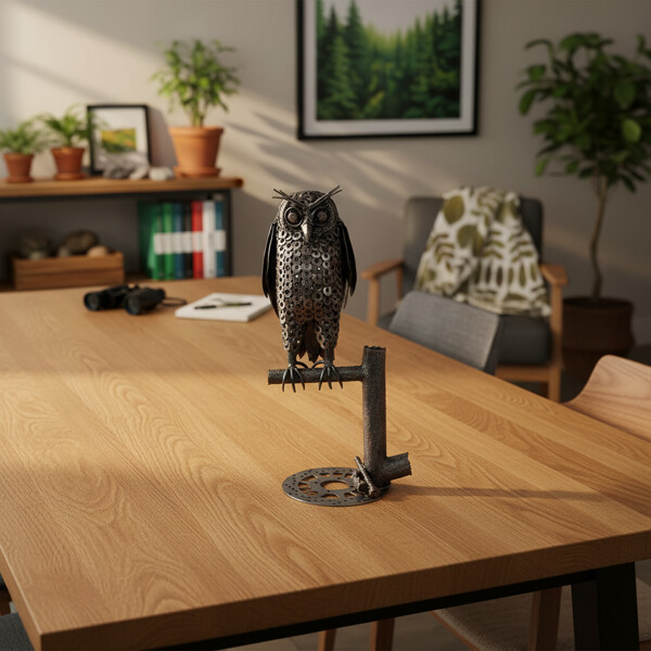 Pryd ditt hem med vår otroliga 100% handgjorda Wise Watcher Owl-metallskulptur! Detta är inte bara en fängslande dekoration; det är ett genuint konstverk, noggrant tillverkat av återvunnet metall, vilket gör det till ett hållbart och fullständigt fascinerande tillskott till vilket hem, kontor, bibliotek som helst. Våra skickliga hantverkare har förvandlat återvunna material – observera den smarta användningen av metallringar för dess fjädrar och återanvända komponenter för dess kloka ögon – till en detaljerad och karaktärsfull representation av den majestätiska ugglan. Stadigt placerad på ett industriellt inspirerat stativ, vilket skapar en verkligen unik skulptur som kombinerar robust industriell estetik med naturens lugna visdom. Mått: Cirka 25 x 15 x 40 cm100% Handgjord Återvunnet Metall