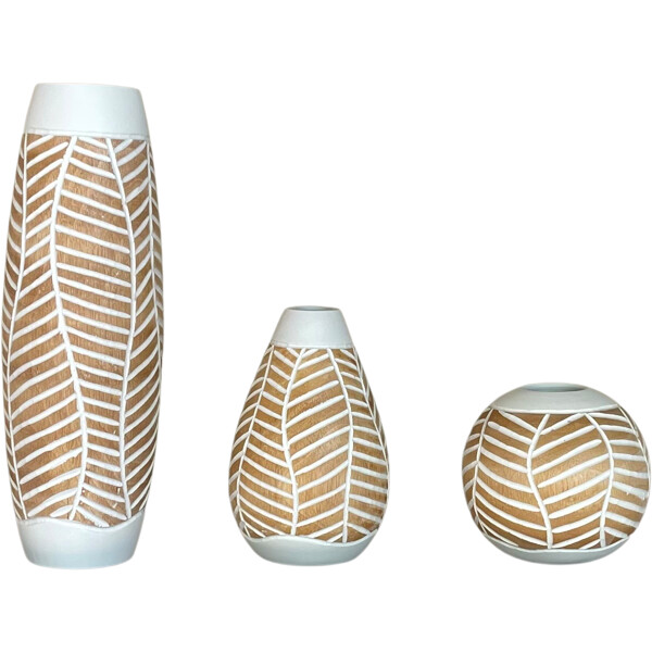 Lägg till en touch av organisk skönhet och hantverksmässig charm till din inredning med denna handgjorda trävas i droppform. Omsorgsfullt tillverkad i Thailand, har den ett unikt vitt bladliknande mönster på naturligt trä, kompletterat med vita detaljer upptill och nertill. Detta miljövänliga föremål är ett äkta hantverk, som tillför hållbar konst och en inbjudande form i ditt hem. Finns i olika former. Storlek: Cirka 13 x 13 x 20 cm Material: Tillverkad av 100% naturligt trä. Handgjord excellens: Varje vas är helt handgjord och genomgår en intrikat process av slipning, snidning, formning, polering och målning, vilket garanterar dess unika karaktär och fantastiska kvalitet. Konstnärlig design: Visar ett fängslande bladinspirerat mönster och en mjuk silhuett, som lägger till en harmonisk och modern estetik till din inredning.