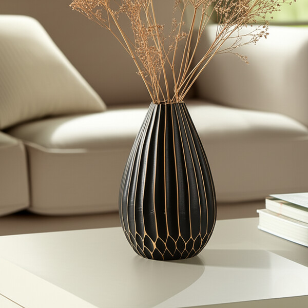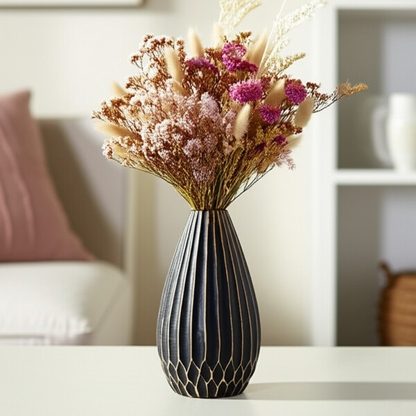 Förhöj ditt hem med den unika texturen och det hantverksmässiga charmen hos dessa vackert handgjorda trädekorationer, tillgängliga i klassiskt svart eller rent vitt. Varsamt tillverkade i Thailand, har varje vas en distinkt vertikalt räfflad yta, kompletterad med ett intrikat bikakemönster vid basen, vilket skapar en fängslande visuell och taktil upplevelse. Dessa miljövänliga föremål är ett bevis på äkta hantverk, perfekta för att försköna ditt utrymme med hållbar konst och modern stil. Storlek: Ungefär 13 x 13 x 20 cm Material: Tillverkad av 100% naturligt trä. Handgjord Excellens: Varje vas är helt handgjord och genomgår en intrikat process av slipning, snidning, formning, utjämning och målning, vilket garanterar dess unika karaktär och överlägsna kvalitet. Miljövänlig: En dekorativ artikel från Thailand som stödjer ett ekologiskt medvetet liv. Unik Textur: Uppvisar en fängslande texturerad yta med vertikala räfflor och en distinkt bikakemönstrad bas, idealisk för att tillföra djup och organisk elegans till din inredning.