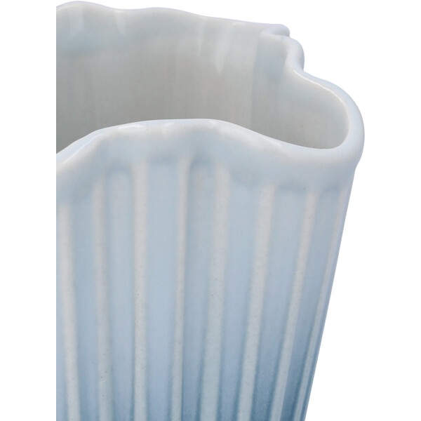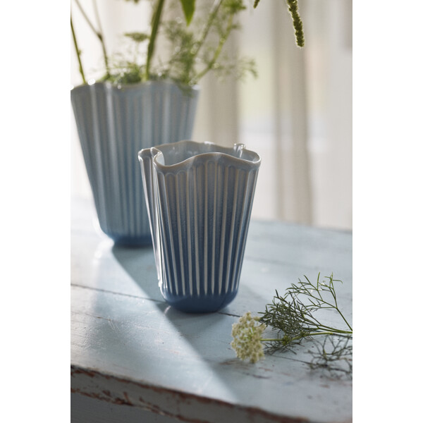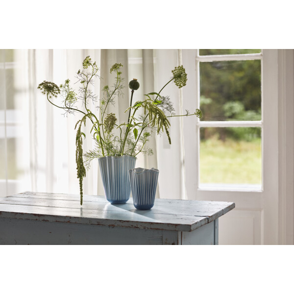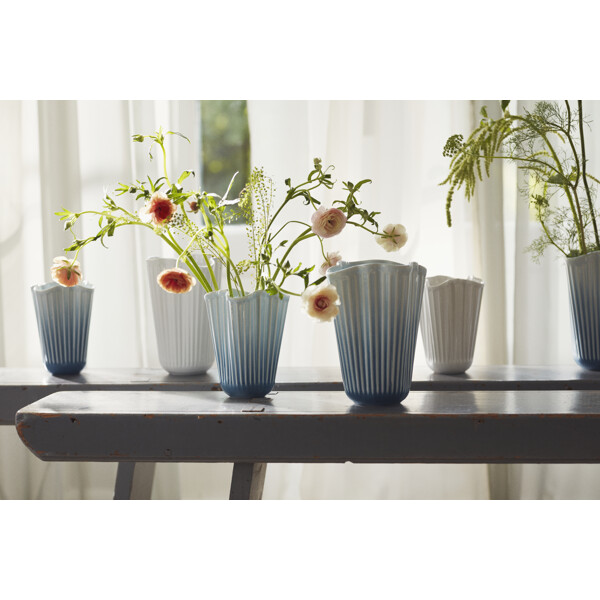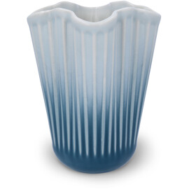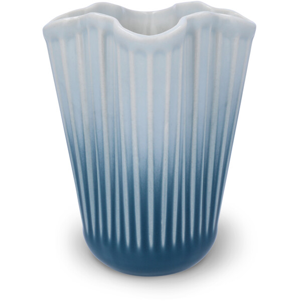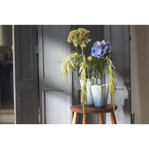 Gott hantverk och originell dansk design vecklas ut i ett nytt och modernt uttryck, formad av tradition. Med Hammershøi Unfold-vaseserien kommer du riktigt nära Kählers både autentiska och moderna uttryck. Det alldeles speciella med Hammershøi Unfold-vaserna är deras veckade form i en mjuk och inbjudande design som gör att blommorna faller på ett annorlunda vackert sätt och lutar sig mer ut mot vasens sidor. På så vis förlängs blommorna visuellt uppåt med hjälp av vasens form, som samtidigt ger ett naturligt stöd till blommorna. Hammershøi Unfold-vaserna är tillverkade i keramik och i det otroligt vackra veckade designen även njuta av hur glasyren gradvis går från en friskt ljusblå färg i toppen av vasen till en djup mörkblå nyans i botten. Njut av den ensam, tillsammans med resten av Unfold-serien, med eller utan blommor, och låt dig förföras av lugnet och den speciella känslan av autentisk dansk kvalitetsdesign som tack vare det suveräna glasurarbetet även kan ge känslan av att stå och blicka ut över havets oändliga storslagenhet. Alla vaser i Unfold-serien har samma unika veckade form som ger serien sitt omisskännliga både moderna och nostalgiska uttryck, och tillsammans med de ikoniska räfflorna knyter den an till Kählers stolta hantverkstraditioner – och pekar samtidigt självsäkert framåt med mycket djup och liv. Hammershøi Unfold är, precis som resten av Hammershøi-serien, skapad av designern Hans-Christian Bauer med inspiration från en av Svend Hammershøis klassiska vaser från 1930-talet, och med sin karakteristiska organiska och lekfulla design ger den dig möjligheten att experimentera och arrangera dina blommor eller kvistar enkelt och naturligt. Det mjuka uttrycket i Hammershøi Unfold står i stor kontrast till den klassiska Hammershøi-vasen, men ett tränat öga ser direkt den stora likheten och den välbekanta känslan i vasens räfflor, material och starka utstrålning. Med Hammershøi Unfold får du en både samtida och nostalgisk tolkning av Kählers autentiska design formad av tradition i ett modernt och framtidsinriktat perspektiv – ett unikt konstverk i ett helt särskilt uttryck av djup och liv, som alltid varit den röda tråden i Kählers stolta hantverkstraditioner.