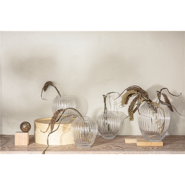 Hammershøi glasvas från Kähler, 15 cm hög. Vasen har de karaktäristiska räfflorna som kännetecknar Hammershøi-serien och formen är inspirerad av de välkända vaserna från serien. Den munblåsta vasen har en egen vacker siluett som har ett enkelt och tidlöst uttryck som klär flera olika typer av blommor. Den stabila vasen är designad av Hans-Christian Bauer. Vasen finns i flera storlekar.