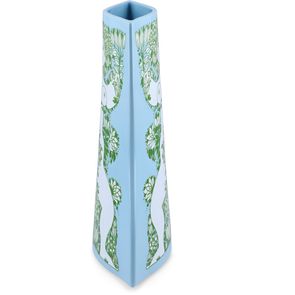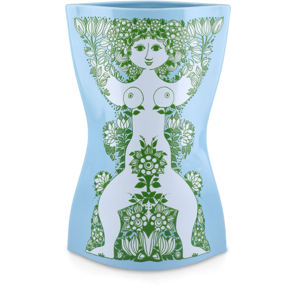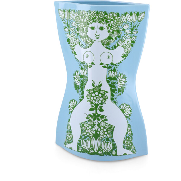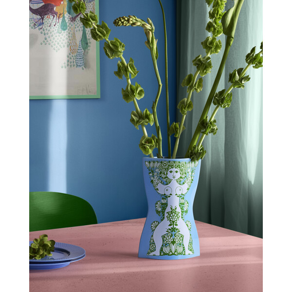 Ett färgstarkt konststatement till ditt hem. Med Nina-serien från Bjørn Wiinblad får du en djärv och konstnärlig tolkning av kvinnokroppen i keramik som hyllar former, frihet och glädje med ikoniska linjer och en levande färgpalett. Ett visuellt kraftfält baserat på originalkonstverk som lyfter rummet – och humöret. Nina är ingen klassisk vas. Det är konst i brukbar form, skapad med inspiration från Bjørn Wiinblads imponerande designarkiv, där en kvinnogestalt tolkas med stark grafisk identitet och skulptural silhuett – dekorerad med färgstark, blomstrande botanik i upphöjda dekaler som både kan ses och kännas. Det här är Bjørn Wiinblad när han är som modigast och mest poetisk. De böljande formerna och sensuella detaljerna står som ett kreativt svar på minimalismen – med ett uttryck som sprudlar av liv, lekfullhet, styrka och stolthet. Nina är en hyllning till kvinnokroppen. En hyllning till individualitet. Och en kärleksfull uppmaning att vara sig själv – utan filter, utan kompromisser. Nina-vasen med en höjd på 28,5 cm präglas av en fräsch ljusblå ton i kombination med kvinnogestalten omsluten av en överdådighet av dekorativa gröna detaljer. En färgstark uppenbarelse av poesi, personlighet och power, som vackert samspelar med Ninas unika karaktär – den böljande formen – som både lyfter fram kvinnomotivet och skapar visuell balans. Nina hyllar former, frihet och glädje – med en somrig och optimistisk färgpalett, en lekfull form och ett imponerande grafiskt uttryck, särskilt kännetecknat av det centrala kvinnomotivet, vars blomkrona och vingar nästan smälter samman i en symmetrisk komposition som är både sensuell och kraftfull. Allt är överfört som färgad dekal på blankglaserad keramik med upphöjt mönster, vilket ger en unik taktil upplevelse. Oavsett vilken Nina-vas du väljer kommer den att ge ditt hem en unik blickfångare och konstnärlig finess, som både kan rymma den vackraste buketten eller stå ensam – helt naken. Och utstråla den djupaste kärlek till allt det som gör oss till dem vi är. Bjørn Wiinblad var en livsglad konstnär med en stor och färgstark personlighet, som inte var rädd för att tänka stort, vara annorlunda – och hylla skönheten i det som sticker ut. Den själen lever fullt ut vidare i Nina, som med sin drömska utstrålning och färgstarka styrka bjuder in oss att göra plats för glädje – och att vara oss själva.