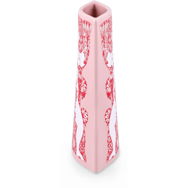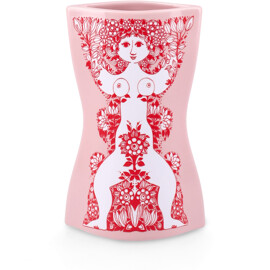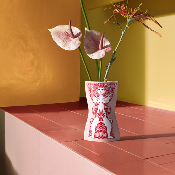 Ett färgstarkt konststatement till ditt hem. Med Nina-serien från Bjørn Wiinblad får du en djärv och konstnärlig tolkning av kvinnokroppen i keramik som hyllar former, frihet och glädje med ikoniska linjer och en levande färgpalett. Ett visuellt kraftfält baserat på originalkonstverk som lyfter rummet – och humöret. Nina är ingen klassisk vas. Det är konst i brukbar form, skapad med inspiration från Bjørn Wiinblads imponerande designarkiv, där en kvinnogestalt tolkas med stark grafisk identitet och skulptural silhuett – dekorerad med färgstark, blomstrande botanik i upphöjda dekaler som både kan ses och kännas. Det här är Bjørn Wiinblad när han är som modigast och mest poetisk. De böljande formerna och sensuella detaljerna står som ett kreativt svar på minimalismen – med ett uttryck som sprudlar av liv, lekfullhet, styrka och stolthet. Nina är en hyllning till kvinnokroppen. En hyllning till individualitet. Och en kärleksfull uppmaning att vara sig själv – utan filter, utan kompromisser. Nina-vasen med en höjd på 16,5 cm präglas av en fräsch rosa ton i kombination med kvinnogestalten omsluten av en överdådighet av dekorativa röda detaljer. En färgstark uppenbarelse av poesi, personlighet och power, som vackert samspelar med Ninas unika karaktär – den böljande formen – som både lyfter fram kvinnomotivet och skapar visuell balans. Nina hyllar former, frihet och glädje – med en somrig och optimistisk färgpalett, en lekfull form och ett imponerande grafiskt uttryck, särskilt kännetecknat av det centrala kvinnomotivet, vars blomkrona och vingar nästan smälter samman i en symmetrisk komposition som är både sensuell och kraftfull. Allt är överfört som färgad dekal på blankglaserad keramik med upphöjt mönster, vilket ger en unik taktil upplevelse. Oavsett vilken Nina-vas du väljer kommer den att ge ditt hem en unik blickfångare och konstnärlig finess, som både kan rymma den vackraste buketten eller stå ensam – helt naken. Och utstråla den djupaste kärlek till allt det som gör oss till dem vi är. Bjørn Wiinblad var en livsglad konstnär med en stor och färgstark personlighet, som inte var rädd för att tänka stort, vara annorlunda – och hylla skönheten i det som sticker ut. Den själen lever fullt ut vidare i Nina, som med sin drömska utstrålning och färgstarka styrka bjuder in oss att göra plats för glädje – och att vara oss själva.