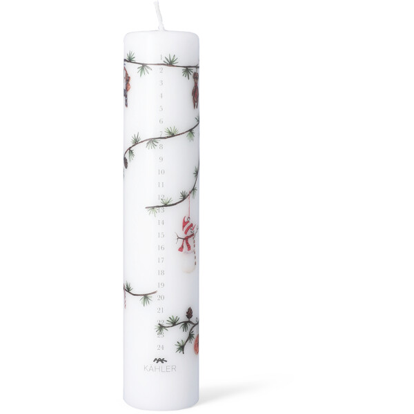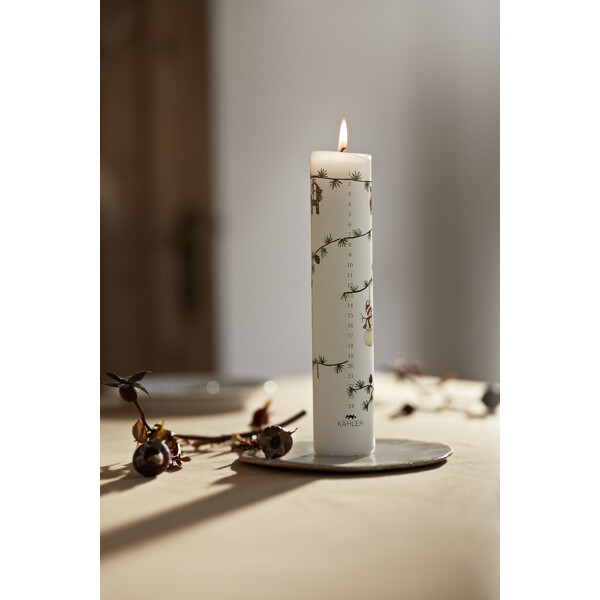 Kliv in i julens magiska och fridfulla värld med Kählers Hammershøi Christmas. En plats fylld av lugn, trygghet och närvaro, där nostalgiska och klassiska julmotiv, målade i akvarell av konstnären Rikke Jacobsen, har överförts till Hammershøi-servisen designad av Hans-Christian Bauer. Även Hammershøi Christmas Adventsljus 2025 är formad av tradition och fylld med charmiga motiv, så att du på vackraste sätt kan räkna ner till julafton. Adventsljuset har en diameter på 5 cm och är 25 cm högt. I linje med tidigare år symboliserar motiven allt som Hammershøi Christmas står för. 2025 års upplaga av det klassiska adventsljuset är naturligtvis försett med siffrorna 1 till 24 och är dessutom dekorerat med en liten julbock med blått sidenband, en söt teddybjörn med röd halsduk, en glad snögubbe med röd luva och halsduk, en liten sovande julmus med röd tomteluva, en skiva apelsin hängande i ett grönt snöre, lite julgodis och ett par flätade julehjärtan. Alla dessa motiv är vackert arrangerade på den välbekanta cedergrenen med lärkkottar. Adventsljuset är tillverkat av fullraffinerat specialvax som brinner jämnt och vackert ända fram till den 24 december.