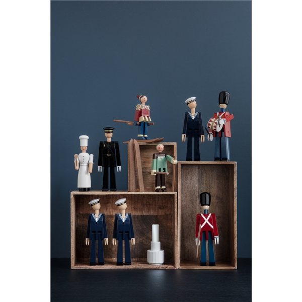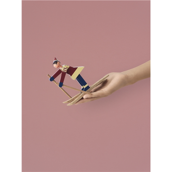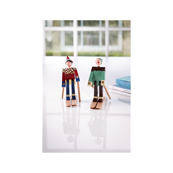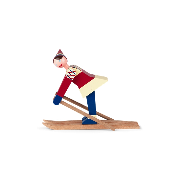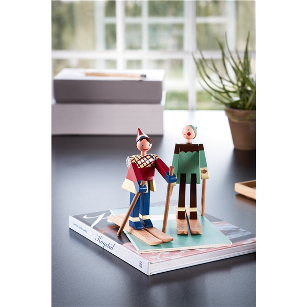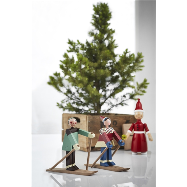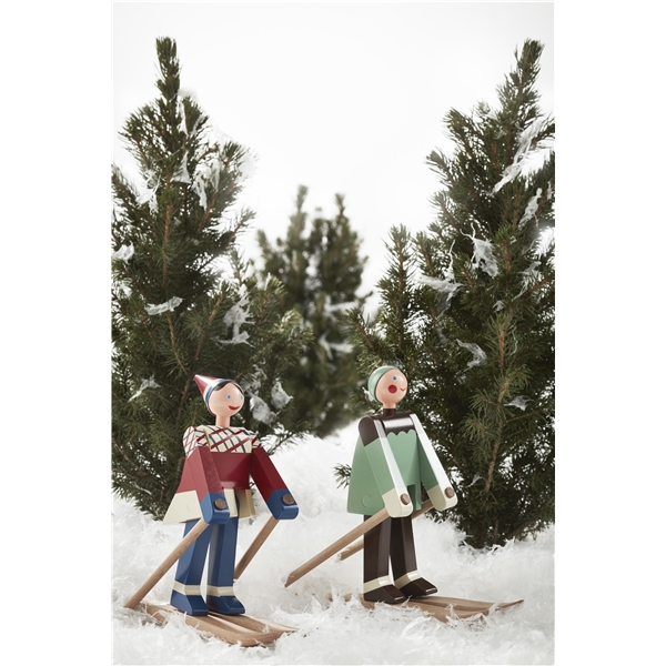 I slutet av 1940-talet ritade Kay Bojesen de två glada skidåkarna. Den glada skidåkarflickan med röda kinder och ett stort leende har fått namnet Datti, som var smeknamnet för Kay Bojesens svärdotter Ruth (gift med Otto). Den manliga skidåkaren, Boje, är uppkallad efter smeknamnet på Kay Bojesens son Otto. De ursprungliga träfigurerna är ganska sällsynta, då de endast tillverkades i små serier. Med sitt muntra uttryck lockar de två skidåkarna alltid fram ett leende och de är med denna nylansering redo att inta de svenska hemmen igen. De två skidåkarna är tillverkade i målat bokträ, precis som Slottsvakten. Skidåkarna är 15,5 cm höga. Storlek: Bredd 17 cm. Höjd 15,5 cm. Djup 6 cm. Material: Målad bok.