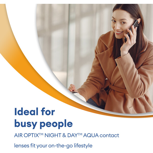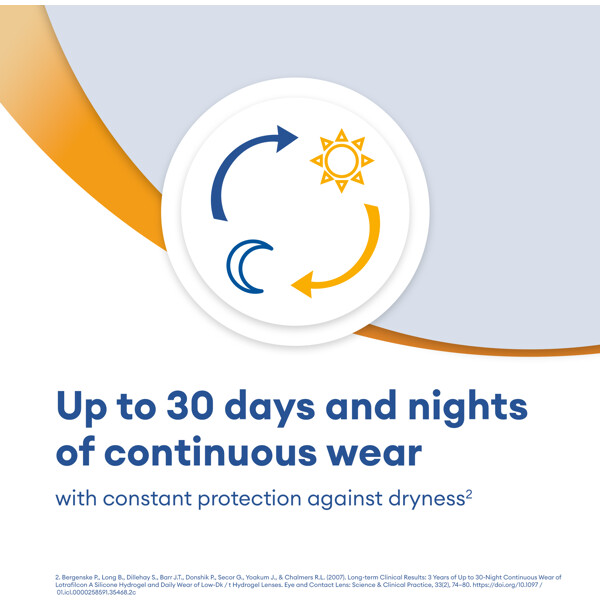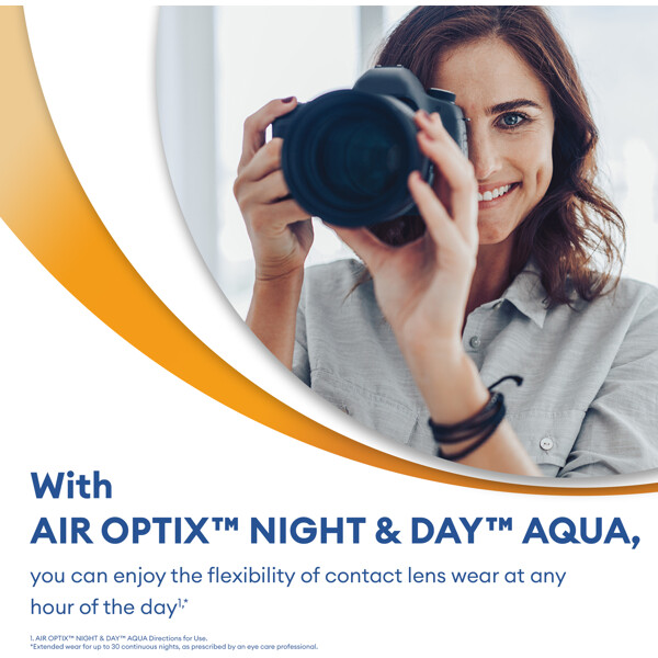 Air Optix Night&Day Aqua är en dygnetrunt-lins från Alcon som i hög grad återfuktar och syresätter ögonen. Linserna består av ett material som har ovanligt hög syregenomsläpplighet vilket gör det möjligt att använda linserna 24 timmar om dygnet i upp till 30 dygn i sträck. Materialet i Air Optix Night&Day Aqua motverkar beläggningar på linsens yta vilket bidrar till hög komfort och ett hälsosamt linsbärande. Air Optix Night&Day Aqua finns i både 3-pack och 6-pack. Air Optix Night&Day Aqua kallades tidigare Air Optix Night&Day. AnvändningDessa dygnetruntlinser används dygnet runt i upp till 30 dygn i sträck.Var noga med att alltid följa din optikers rekommendationer för hantering och användning av kontaktlinser då bärschemat för linser är individuellt anpassat.